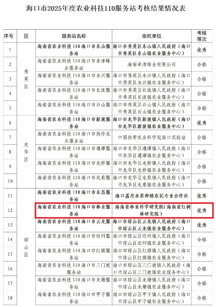 近日,海口市科学技术和工业信息化局公布《海口市2025年度农业科技110服务站考核结果》,依托海南省林业科学研究院(以下简称“省林科院”)组建的海南省农业科技110海口市林业服务站(以下简称“科技110林业服务站”)获评“优秀”等次。