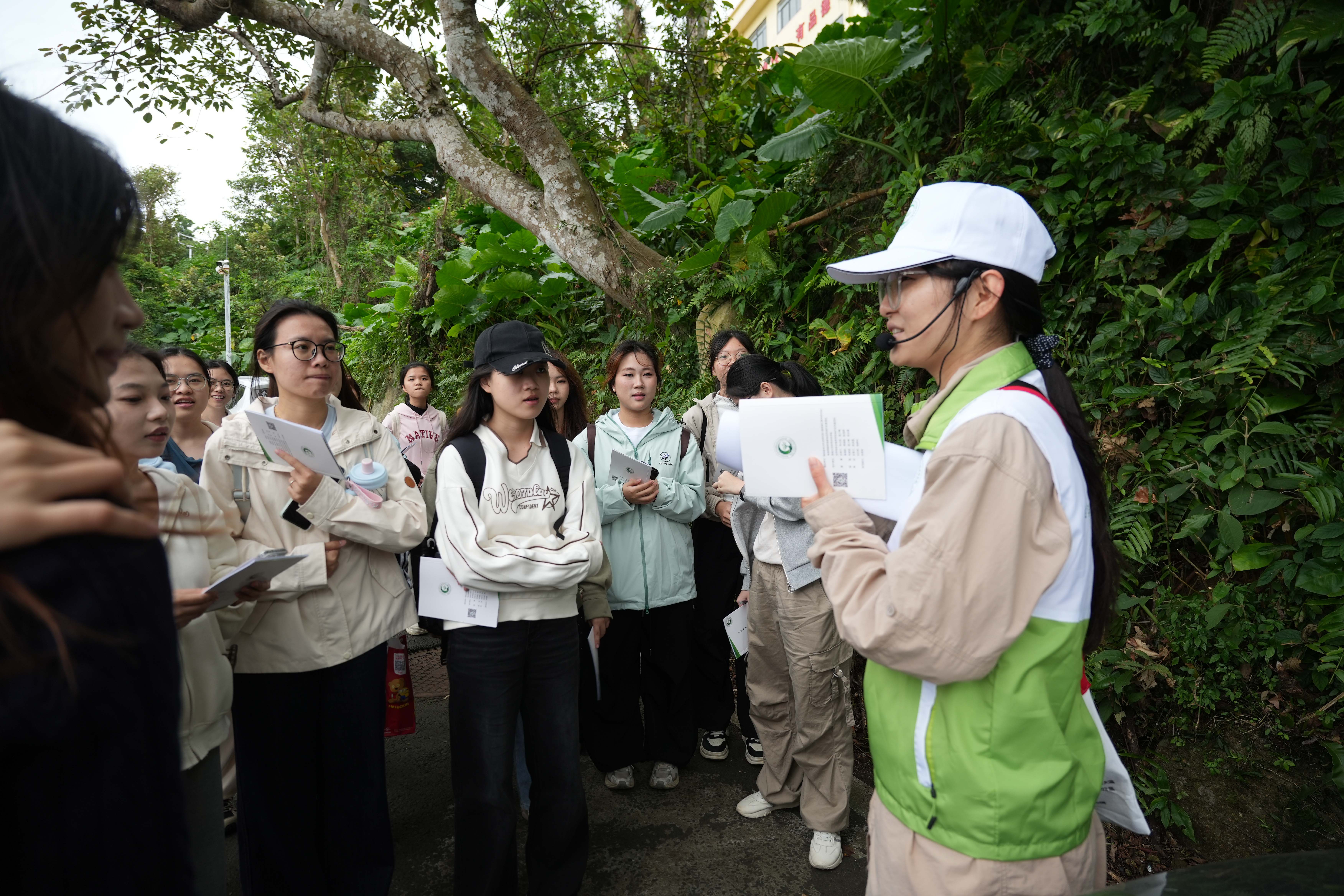 走进海南铜鼓岭国家级自然保护区,同学们深入热带滨海雨林腹地,与“植物奇观”近距离邂逅。大家实地观察“根抱石”“空中花园”等独特生态景观,系统了解其形成机制与生态价值。现场,大家以自然笔记记录观测心得,在沉浸式体验中深刻领悟热带滨海雨林的生态系统结构与物种共生逻辑,筑牢生态保护的认知根基。