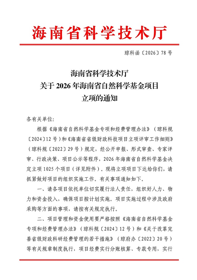 近日,海南省科技厅正式公布2026年度海南省自然科学基金项目立项结果,我院科研工作再传捷报,4项青年科学基金项目成功获批。在立项数量与质量上均实现稳步提升,充分彰显了我院在林业生态科研领域的强劲实力,以及青年人才队伍的蓬勃活力与创新能力。