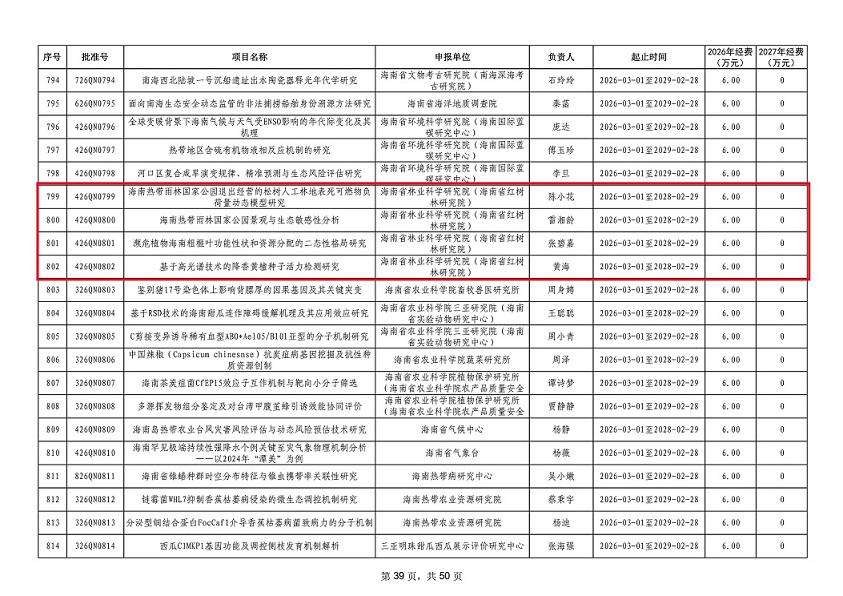 此次获批立项的4个项目,紧密围绕海南热带雨林国家公园生态保护、珍稀濒危植物保育、林木种质资源保存等核心研究领域,精准对接国家生态文明试验区建设与海南自贸港绿色发展战略需求,兼具前沿性、原创性与实践应用价值,是我院长期深耕热带林业基础研究、主动服务地方生态建设的重要成果体现。项目成功立项,既是对我院科研团队专业素养与研究能力的高度认可,也标志着我院青年科研人才梯队建设取得显著成效,科研创新生态持续优化、良性发展。
